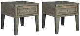 Celebrating the lighter side of modern industrial style, this 2-piece end table set is the best in form meets function. The table’s less-is-more weathered finish allows the natural wood grain to take center stage. Metal bracket accents and tapered metal legs in a silvertone finish are a cool yet refined touch. A smooth-gliding drawer offers plenty of handy storage.
