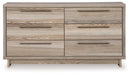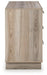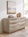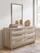 Modern meets neutral and sophisticated in this dresser with mirror. Its natural finish, subtle replicated wood grain and clean lines wake up your bedroom with eye-catching appeal. The generous storage space in its smooth-gliding, lined drawers brings function to relaxed refinement. Elongated handles in a champagne tone speak casual simplicity, creating a smart and stylish bedroom retreat.