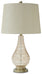 This table lamp package feeds your design appetite. The curvy silhouette permeates your room with contemporary romance, while the champagne-hued glass body is a soft and feminine finish. Brass-tone base finesses the look with a sleek touch.