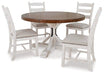 This 5-piece dining set serves up the best in rustic farmhouse living. The extension dining table's two-tone distressed finish pairs a brown tabletop with a vintage white base for a double helping of charm. And the upholstered chair, with timeless ladderback styling and a comfortably cushioned seat, is something to savor.