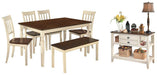 Incorporate cottage-cool warmth in your dining space with this dining room set. Its two-tone finish serves up twice the charm and character. Side chairs are in a classic rake back design. The bench is straight out of a country cottage. Its unique two-tone finish brings a relaxed and timeless look to the table. This piece can also be used as a welcome addition in a mudroom or casual living area.