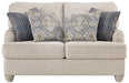 Chillax. When it comes to high style that’s beautifully on budget, this sofa and loveseat set in denim blue has you covered. Distinctive elements include dramatically flared armrests, box cushions and chic tufting for that touch of texture. Geometric patterned pillows enhance this living room set’s contemporary appeal.