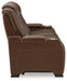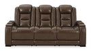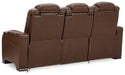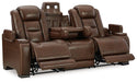 Reserved for him and made for her, this power reclining sofa in gray delivers all the comfort and style you could ask for. Inspired by sports car interiors, the combination leather and faux leather upholstery has a “perforated automotive†treatment for that much more appeal. Positioned at your fingertips, the advanced one-touch power control puts you in the driver’s seat with everything from an Easy View™ power headrest and power lumbar support, to a USB port and wireless charging for your phone. Talk about fully loaded. The middle seat reveals a pull-down table with dimmable reading lights and cup holders. And with integrated cup holders and hidden storage compartments under the posh, padded armrests, this designer power reclining sofa makes the most of every inch of space.