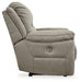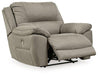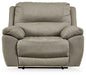 Kick back, relax, and enjoy some sports on TV with this power oversized reclining chair. You will love its extra wide seat, double stuffed pillow top arms and soft-as-suede faux leather upholstery. The family-friendly dark gray color and creative stitching add panache. You can fully recline in infinite positions of comfort even if floor space is limited, thanks to the space-efficient zero wall design. This bustle back recliner will always be a win.