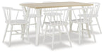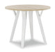 Bring light to your dining area with the clean lines and bright two-tone finish of this dining package. The round dining table, with stylized saber legs in a white finish, matches the spindle-back chairs for beautiful simplicity. The table’s melamine top, in a light tan color, provides additional durability, marrying minimalism with big style for a delightful combination.