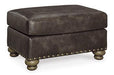 Enticing with a coffee brown faux leather, beautified with a gently weathered effect and designer stitching, this sofa, loveseat, chair and ottoman set merges a richly traditional sense of style with modern comfort. Roll arms, turned bun feet and prominent nailhead trim incorporate distinctive character, while the jacquard-patterned pillows add a sumptuous touch. Rest assured, the matching ottoman provides the perfect place to kick up your heels.